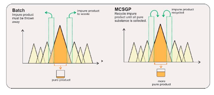 ????? MCSGP(Multicolumn Countercurrent Solvent Gradient Purification)用于精純環(huán)節(jié),無需通過耗時(shí)的實(shí)驗(yàn)設(shè)計(jì)(DoE)確定工藝條件,可有效克服典型SMB(模擬移動(dòng)床)僅適用于二元分離、無法實(shí)現(xiàn)線性梯度的缺點(diǎn)。