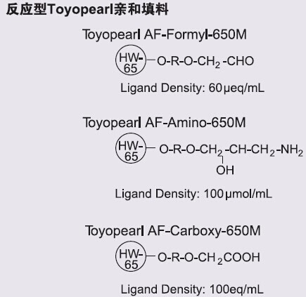 ??? 在溫和的條件下,Toyopearl AF-Formyl-650M(含醛基)唯一與伯胺耦合,形成穩(wěn)定的仲胺鍵。多種工業(yè)用酶都能固定于含醛基的填料上。通常,工業(yè)用戶用部分氧化多糖支持物(如纖維素和瓊脂糖)或部分水解聚縮醛合成這些填料。相比之下,TOYOPEARL AF-Formyl-650M是一個即用型含醛基穩(wěn)定的大孔徑填料。東曹公司可以保證每批的醛含量以及物理性質(zhì)保持一致。