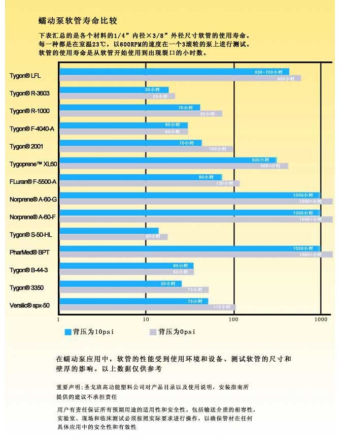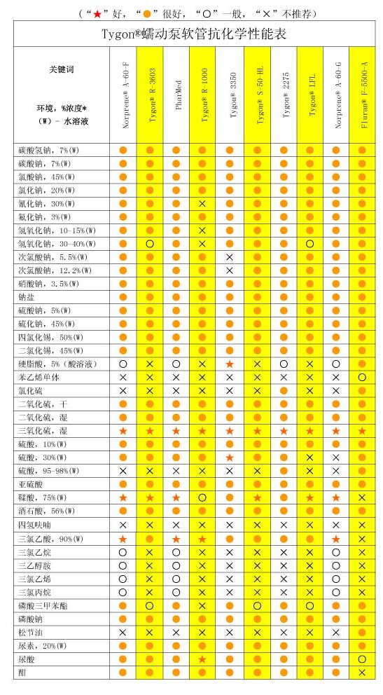 4、溫度:泵頭管不同材料有不同的溫度表現(xiàn)。有些管材如硅橡膠具有較寬溫度承受范圍,對高溫、低溫過程均適宜;而有些管材如Tygonˉ 及 C-Flexˉ則只適于某一較小的溫度范圍。最終用戶在選擇管材前,應(yīng)先弄清系統(tǒng)中的最高溫度和最低溫度,然后確保所選泵管安全工作于此溫度區(qū)間。