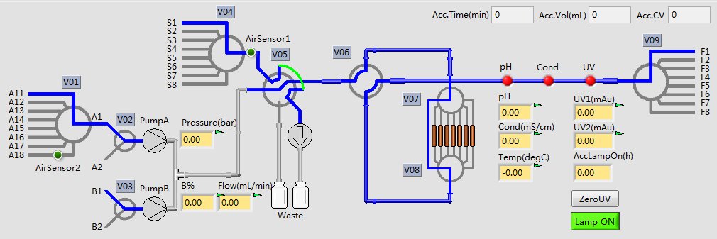 6、全自動柱流向切換閥門,可實現(xiàn)層析柱正、反向流動及旁路功能;