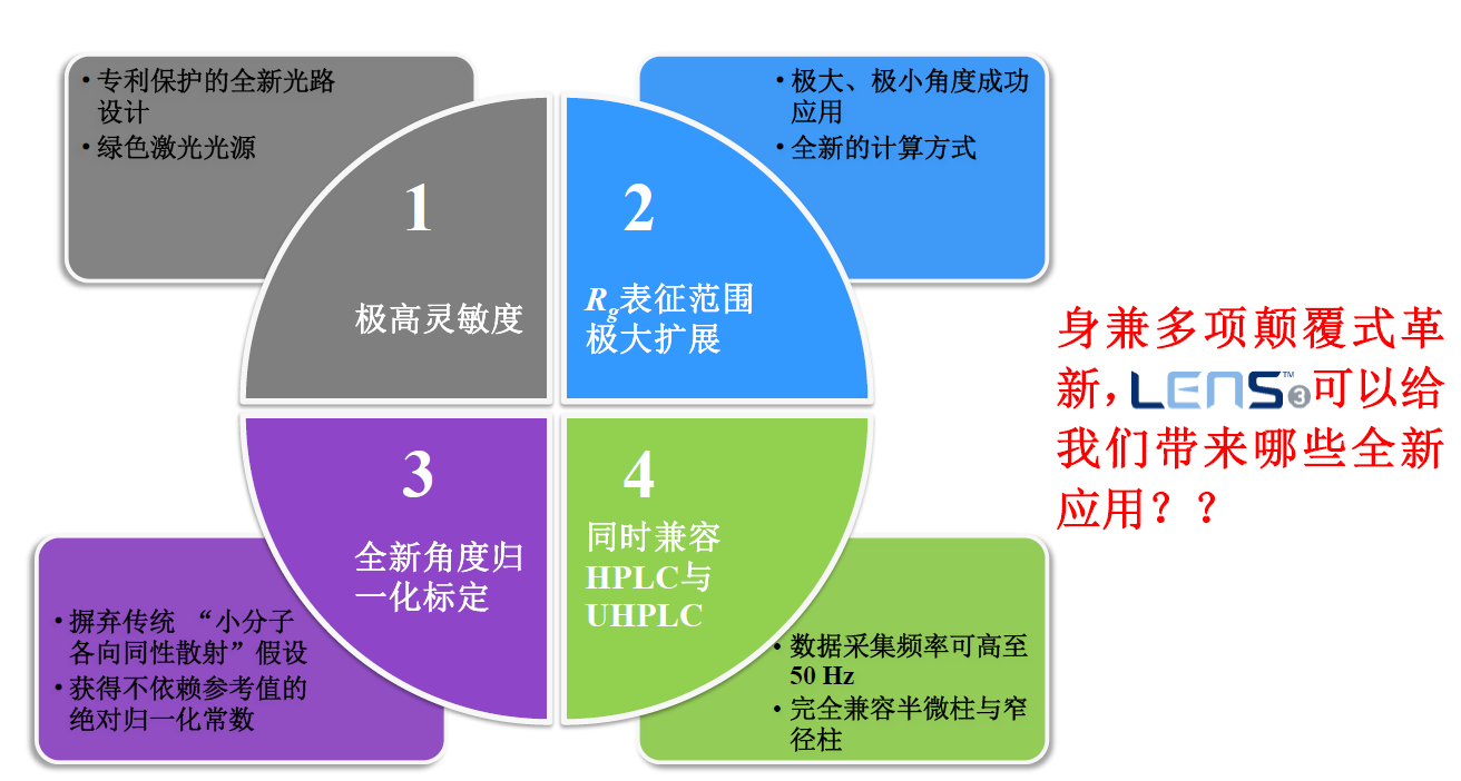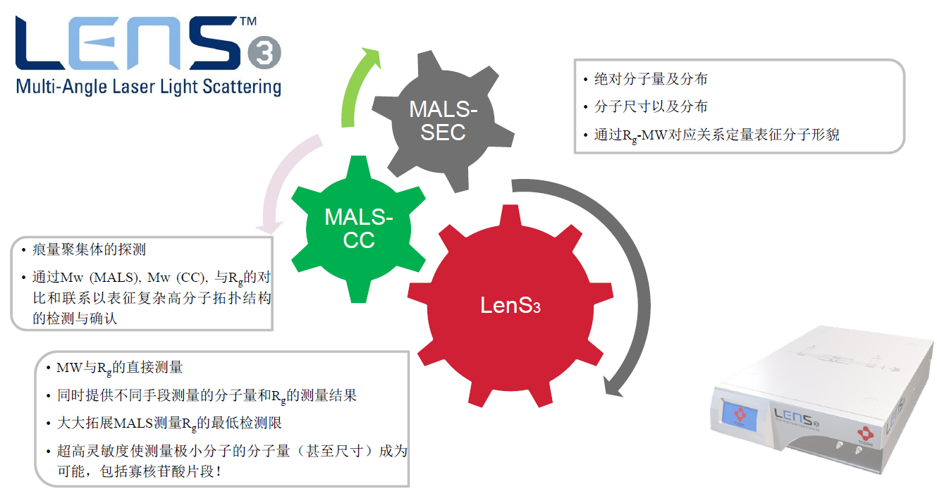 相較于自上世紀(jì)80年固有的光散射技術(shù),東曹推出的LenS3光散射采用全新設(shè)計(jì)概念,完美集成的一個(gè)極小角度(10°的LALS),一個(gè)極大角度(170° High Angle Light Scattering, HALS),和一個(gè)直角度(90°的RALS),從而達(dá)到: