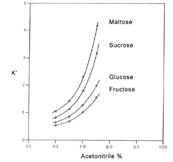 糖類的分離通常用到的是乙腈/水做流動相。當(dāng)乙腈的含量增加,保留因子k’增加。但是乙腈的含量需要仔細(xì)的控制,因為隨著乙腈含量的增加,樣品的溶解性會變差。