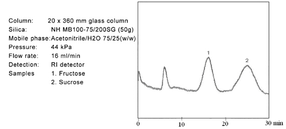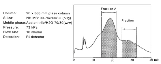? ? ? 糖類物質(zhì)的分析和制備,在液相色譜領(lǐng)域占有重要的地位。迄今為止,大多數(shù)的分離介質(zhì)僅僅局限在分析級別。但是富士硅膠研發(fā)出用于制備色譜的新的氨基硅膠。當(dāng)使用高水相為流動相時,一般的氨基填料會暴露出很多問題。氨基硅膠的pH值很高,一般pH為9.0,在這樣高的pH條件下,目標(biāo)化合物一般都會變性,并且會毀壞硅膠基質(zhì)的表面??紤]到這些問題,富士公司研發(fā)出新的氨基硅膠填料,稱之為NH SG硅膠。NH SG硅膠可以最小化甚至是避免上述問題,并且對糖類化合物進(jìn)行更好的分離。