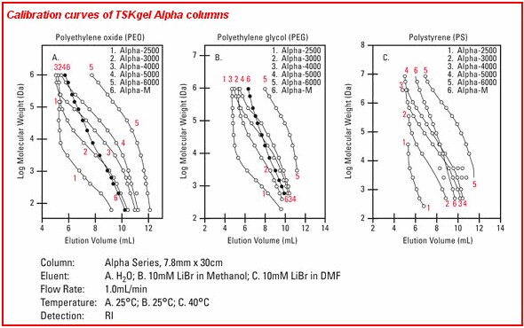 1. TSKgel Alpha系列色譜柱由親水性球形聚甲基丙烯酸酯顆粒填充。