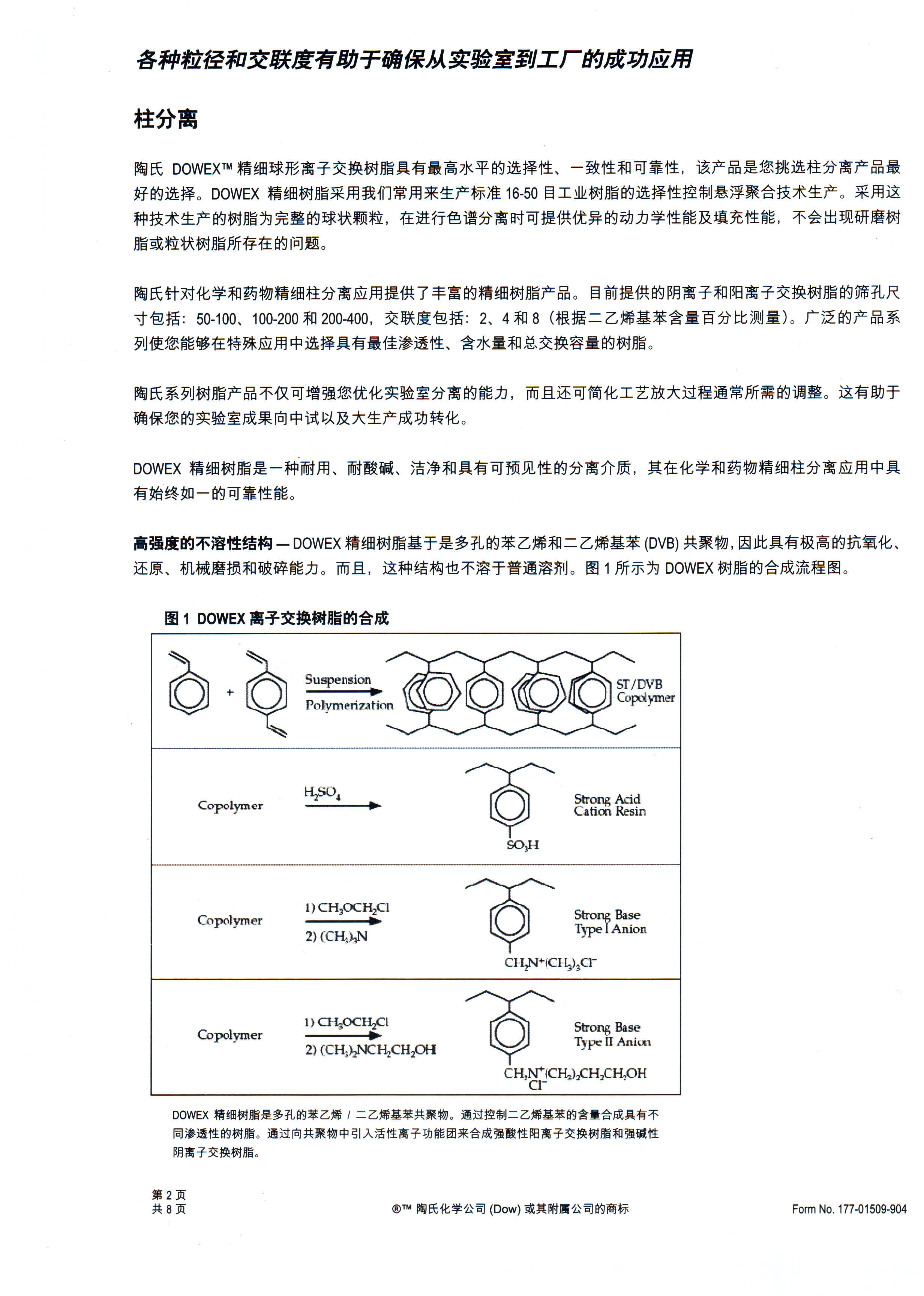 ?????? DOWEX系列離子交換色譜分離樹脂有強酸性陽離子交換樹脂和強堿性陰離子交換樹脂兩大類,每一類又根據(jù)交聯(lián)度(即DVB%)的不同劃分為3個小類,分別以“×2”、 “×4”與“×8”表示,在此基礎上進一步提供3個粒度范圍可供選擇,即150-300μm(50-100目)、75-150μm(100-200目)以及35-75μm(200-400目),共計18個樹脂牌號。顯然,不同交聯(lián)度的樹脂含水量不一,體積交換量、物質(zhì)擴散的阻力各異,如此寬泛的產(chǎn)品范圍豐富了客戶的試用選擇,可以針對具體的應用優(yōu)選出適宜的色譜分離樹脂。