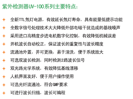 檢測器指能檢測色譜柱流出組分及其量的變化的器件。對檢測器的要求是:靈敏度高,線性范圍寬,重現(xiàn)性好,穩(wěn)定性好,響應(yīng)速度快,對不同物質(zhì)的響應(yīng)有規(guī)律性及可預(yù)測性。QuikSep UV全波長檢測器可設(shè)置2個波長同時檢測!