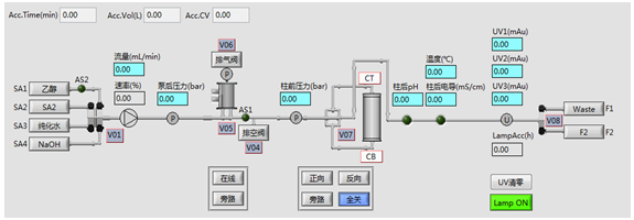 層析系統(tǒng)軟件符合新版GMP規(guī)范,采用圖形化界面、全自動操作,簡明扼要,任何操作及狀態(tài)均可實時顯示在主界面狀態(tài)欄中,自動化程度高。結(jié)合了大量的容錯性設(shè)計,貼合生產(chǎn)實際,降低了對研發(fā)人員的技能要求。