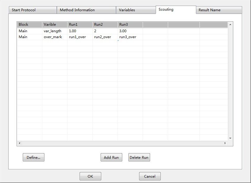 Scouting,即探索功能,通過將方法中的某些參數(shù)編輯成變量,然后通過Scouting設(shè)置,將同樣的方法運行多次,每次僅僅是自動修改方法中的某個或某些參數(shù),從而實現(xiàn)參數(shù)的自動尋優(yōu),譬如尋找最適合的流速、尋找最適合的裝柱高度等。