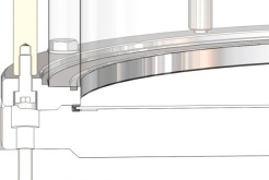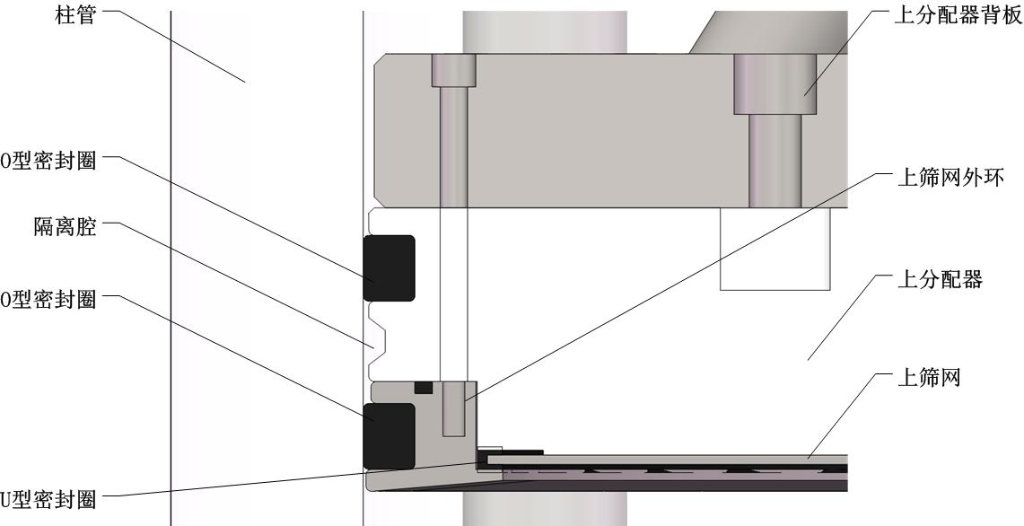 層析柱密封結(jié)構(gòu)主要考慮密封的可靠性、有效面積最大化和死體積的最小化三個(gè)方面。柱頭的密封形式如下圖所示,柱管與移動(dòng)的柱頭之間采用雙層O型密封圈進(jìn)行密封,起到雙重密封的作用。