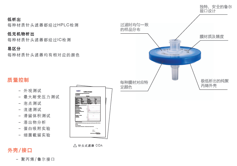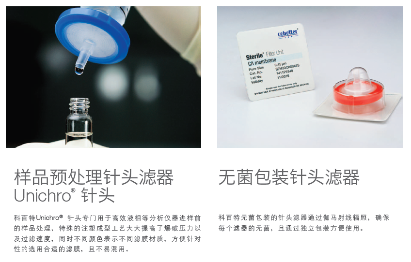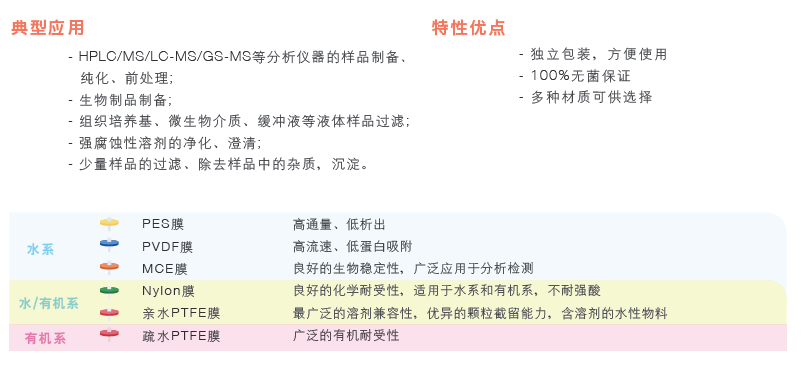 科百特針式過濾器采用PES/PCDF/Nylon/親水PTFE/GF等濾材,以過濾不同性質(zhì)的物料,設(shè)計(jì)采用超聲波焊接技術(shù),減少使用時(shí)從側(cè)面漏液的風(fēng)險(xiǎn),同時(shí)每個(gè)針頭根據(jù)膜材質(zhì)的不同而采用不同顏色標(biāo)注,為您提供高效、快速的過濾選擇!