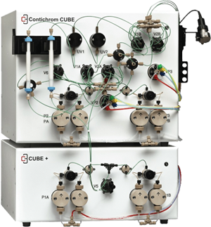 所有的Contichrom系統(tǒng)可以將兩個層析步驟(例如捕獲和精純)整合為一個單一的過程,第一步層析洗脫的產(chǎn)物可以直接被稀釋,從而直接進(jìn)行第二步層析,因此省略了中間的間歇過程,這是非常適用于高通量純化的。