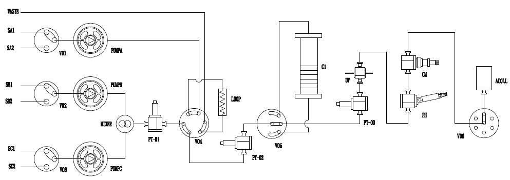 * 本系統(tǒng)采用流路最小化設(shè)計(jì),器件之間十分緊湊,整體流路容積很小。流路為標(biāo)準(zhǔn)手緊接頭連接固定,方便快捷的同時(shí),大幅度減小系統(tǒng)死體積。