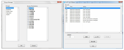 系統(tǒng)采用五級(jí)用戶管理權(quán)限,可對(duì)用戶權(quán)限進(jìn)行自定義分配,并可在運(yùn)行中更換用戶(便于交接班)。完善的審計(jì)追蹤及電子簽名功能,符合cGMP法規(guī)要求。