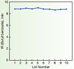 ??? 上圖顯示了疏水性作用的10批生產(chǎn)的批間再現(xiàn)性,這是色譜柱的基本參數(shù),通過(guò)對(duì)生產(chǎn)過(guò)程的嚴(yán)格控制,獲得極穩(wěn)定的批間再現(xiàn)性。其顯示了非常高的批次間重復(fù)性,在分析丁苯時(shí)候,以10批柱子的數(shù)據(jù)為例,保留時(shí)間的標(biāo)準(zhǔn)偏差小于1.5%,這數(shù)據(jù)大大低于普通的C18色譜柱。分析標(biāo)準(zhǔn)物質(zhì)時(shí),每根色譜柱的理論塔板數(shù)可達(dá)18600,壓力為2600psi。